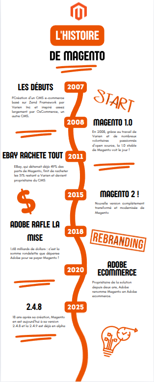 De sa naissance en 2007 en tant que CMS interne de Varien Inc., en passant par son rachat d’abord par eBay puis par Adobe, jusqu’à la 2.4.9 annoncée pour l’an prochain, Magento a sacrément bourlingué.